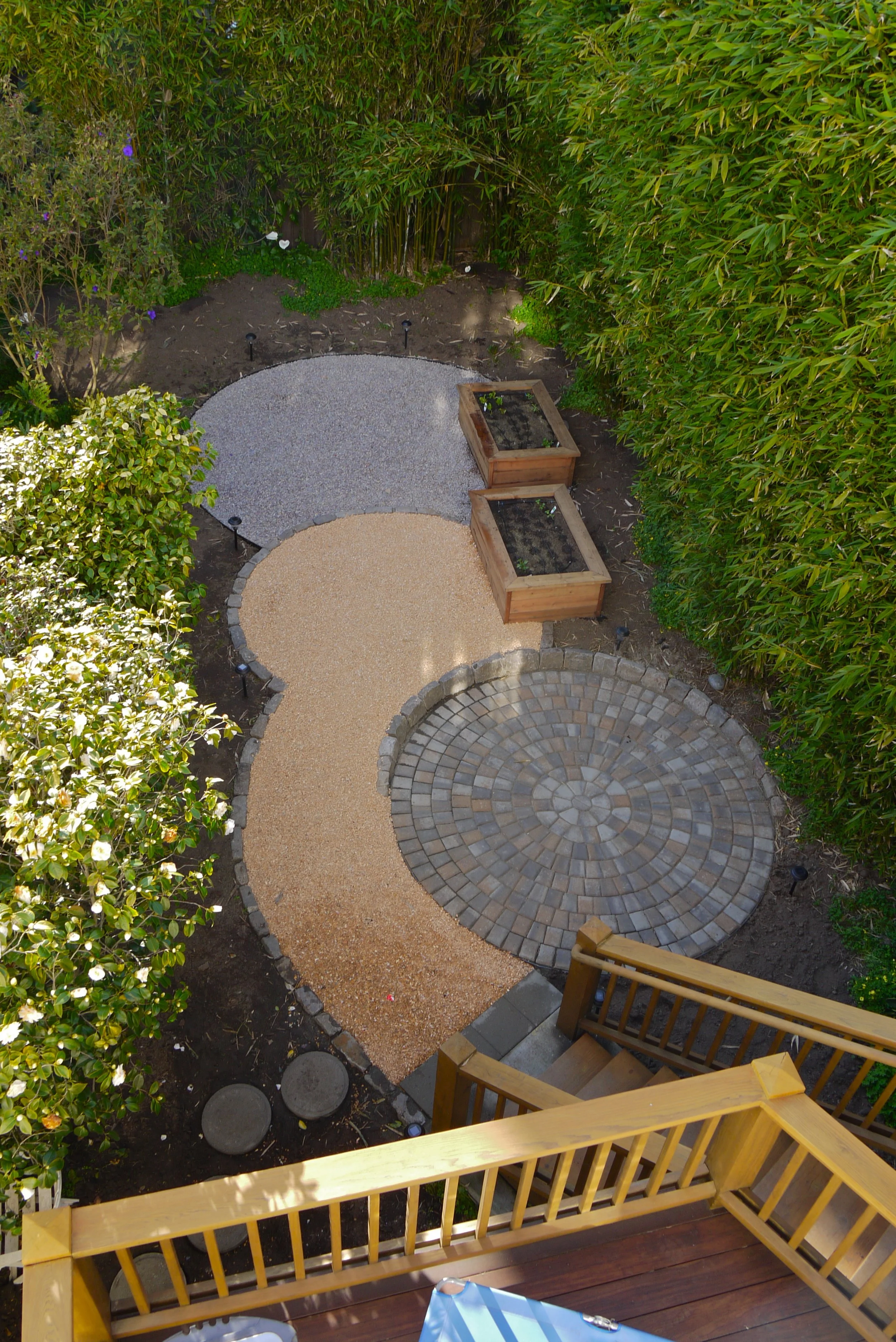 Small hardscape for particular needs, prior to planting. Raised vegetable beds provide rich soil for healthy vegetables, and also provide casual seating. Raised beds were also oriented for maximum sun.